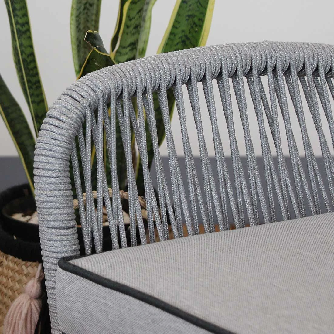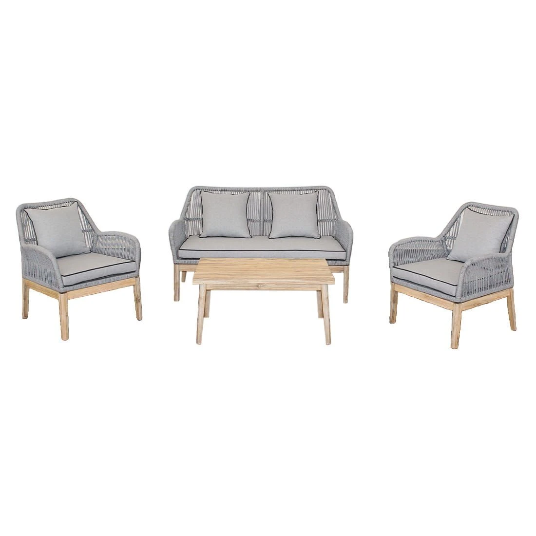 Für das Gestell und die Tischplatte kommt Akazienholz zum Einsatz. Damit das Loungeset optisch ansprechend ist, sind der Korpus und der Bezug im Farbton Hellgrau gehalten. Optisch begeistert das Gestell in der Farbe Natur. Das Gestell ist mit Rope umflochten und bringt somit modernes Flair auf Ihre Terrasse. Der Bezug des Loungesets ist aus Polyester gefertigt. Für eine längere Haltbarkeit empfehlen wir bei stärkerem oder lang anhaltendem Regen, die abnehmbaren Kissen im Innenraum zu lagern. Farblich überzeugt die Tischplatte in Akazie geölt.