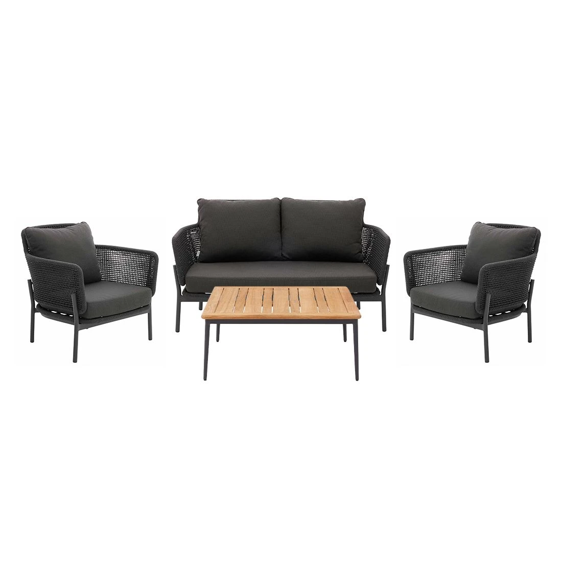 Als Material des Gestells hat der Hersteller hochwertiges Aluminium gewählt. Optisch begeistert das Gestell in der Farbe Anthrazit. Für die Bespannung der Sitzfläche wird hochwertiges Rope verwendet. Es zeichnet sich durch eine hohe Robustheit. Die Bezüge sind aus dem Marken-Outdoorstoff Olefin gefertigt. Das Material verbindet eine angenehme Stoffoberfläche mit hoher Witterungsbeständigkeit. Denn sowohl Sonne als auch Regen können dem robusten Outdoor-Stoff kaum etwas anhaben. Die Farbe des Bezugs ist Dunkelgrau. Teak ist außerordentlich widerstandsfähig gegen Witterungseinflüsse wie Schwankungen der Temperatur, Nässe und Trockenheit. Kein Wunder, dass das hochwertige Holz als Material für die Tischplatte ausgewählt wurde. Die Tischplatte ist Natur.