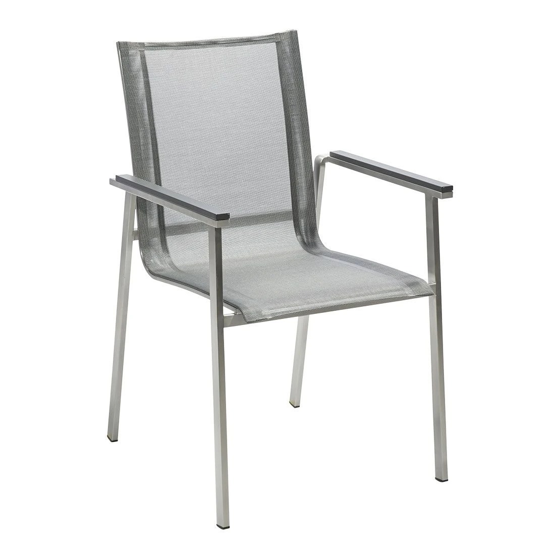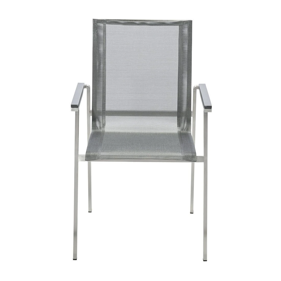 Das Gestell wird aus hochwertigem und rostfreiem Edelstahl hergestellt. Aufgrund des etwas höheren Eigengewichts, steht der Stapelsessel dadurch besonders stabil und windsicher auf der Terrasse. Für eine attraktive Optik ist das Gestell im Farbton Silber gehalten. Für die Bespannung der Sitzfläche verlässt sich der Hersteller auf hochwertiges Textilene. Es zeichnet sich durch eine hohe Robustheit gegenüber Hitze und Frost aus und ist leicht zu reinigen. Die Farbgestaltung der Sitzfläche in Silbergrau ist überaus ansprechend.