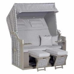 Als Bezug dient bei diesem Strandkorb ein Gewebe aus Strukturpolyester. Das Material verbindet eine angenehme Stoffoberfläche mit hoher Witterungsbeständigkeit. Der Strandkorb selbst besteht aus Pinienholz sowie Kunststoffgeflecht. Beides harmoniert hervorragend miteinander. Das Grundgerüst des Strandkorbs ist in Grau gehalten. Äußerlich begeistert der Strandkorb Cliff mit seinem Kunststoffgeflecht im Farbton Onix.