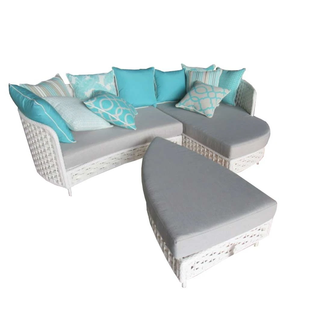 Damit die Sonneninsel optisch ansprechend ist, sind das Gestell und die Sitzfläche im Farbton Weiß gehalten. Das Gestell ist aus Aluminium hergestellt. Das Gestell, das mit hochwertigem Polyrattan umflochten ist, bringt ein natürliches Ambiente auf Ihre Terrasse. Dieses Material zeichnet sich durch eine hohe Wetterbeständigkeit aus. Die Sitzfläche ist angenehm gepolstert. Die Farbe des Bezugs ist Grau. Die Tischplatte ist Hellgrau.