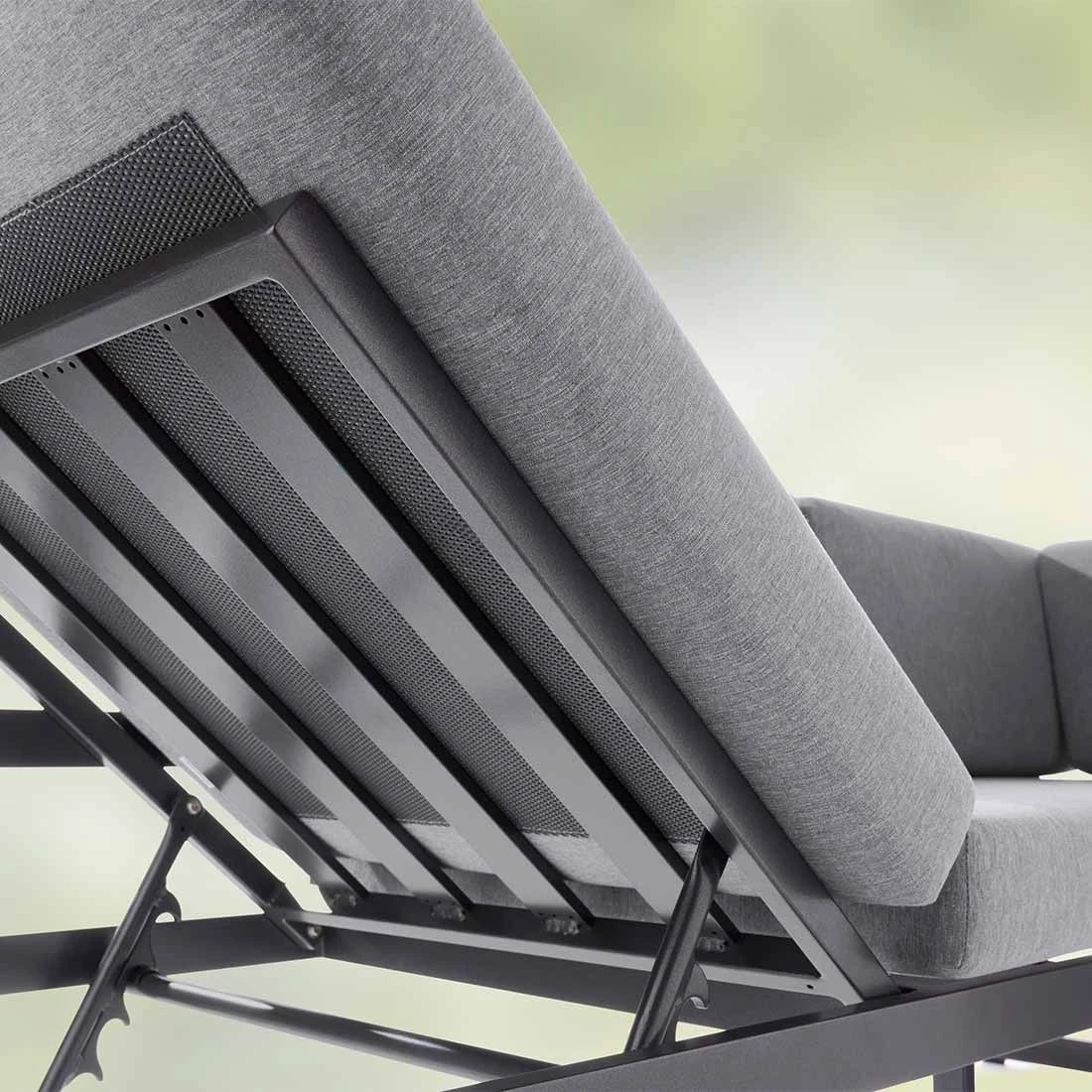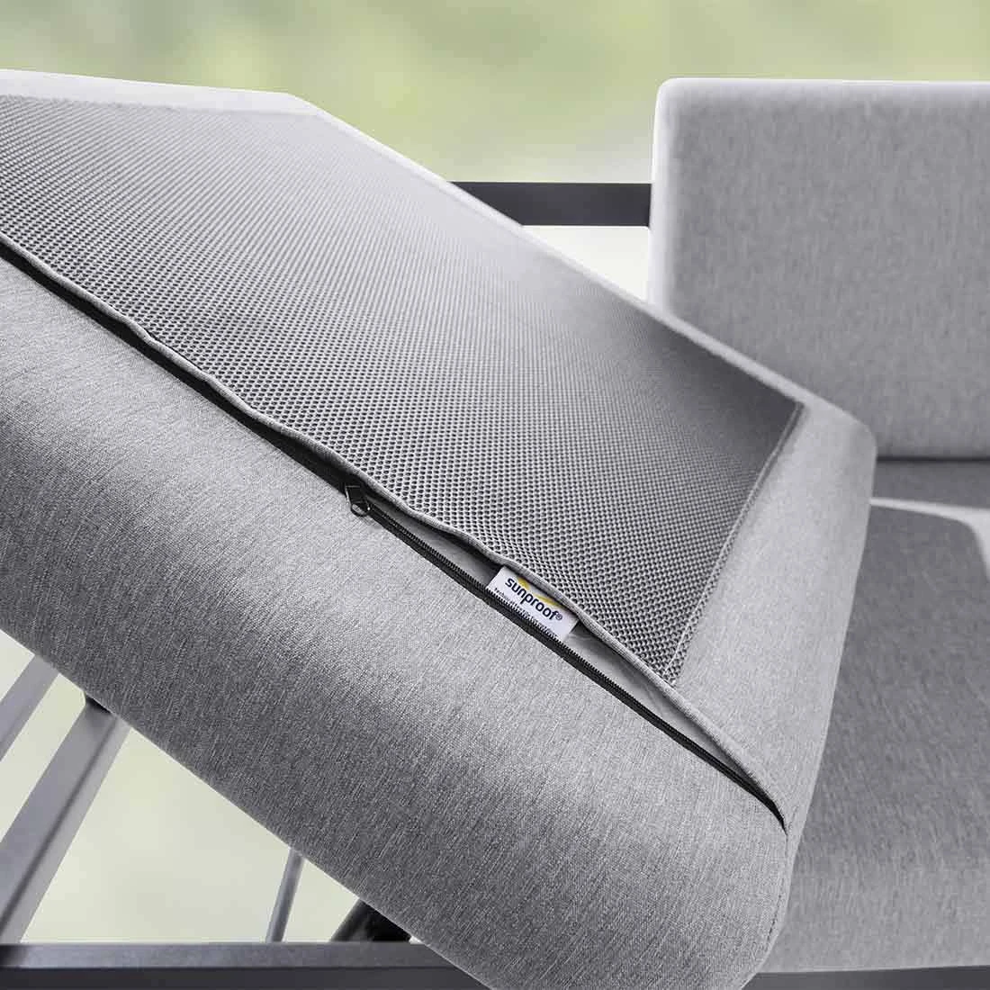 Das Gestell besteht aus Aluminium. Optisch begeistert das Gestell in der Farbe Eisengrau. Die Bezüge sind aus dem wasserabweisenden Markenstoff Sunproof gefertigt und damit auch besonders lichtecht und UV-beständig. Die Farbe des Bezugs ist Hellgrau.