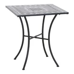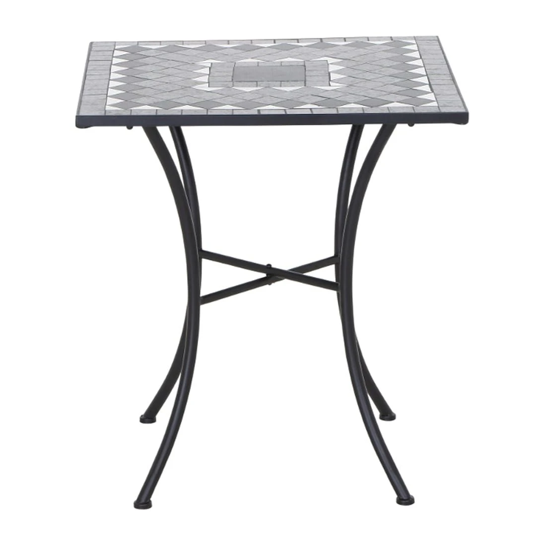Als Gestellmaterial wird robuster Stahl verwendet. Dass ein Möbelstück auch ein Hingucker sein kann, beweist dieses Modell mit seinem außergewöhnlichen Gestell in X-Form. Für die Tischplatte wird hochwertiges Keramik verarbeitet, das auf der Terrasse und im Garten eine angenehme Wohlfühl-Atmosphäre fördert. Für ein stimmiges Gesamtbild erscheint die Platte in der Farbe Mosaik. Mit der kompakten quadratischen Form sorgt der Gartentisch auch auf beengtem Raum für Gemütlichkeit.