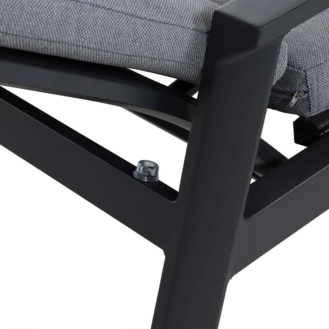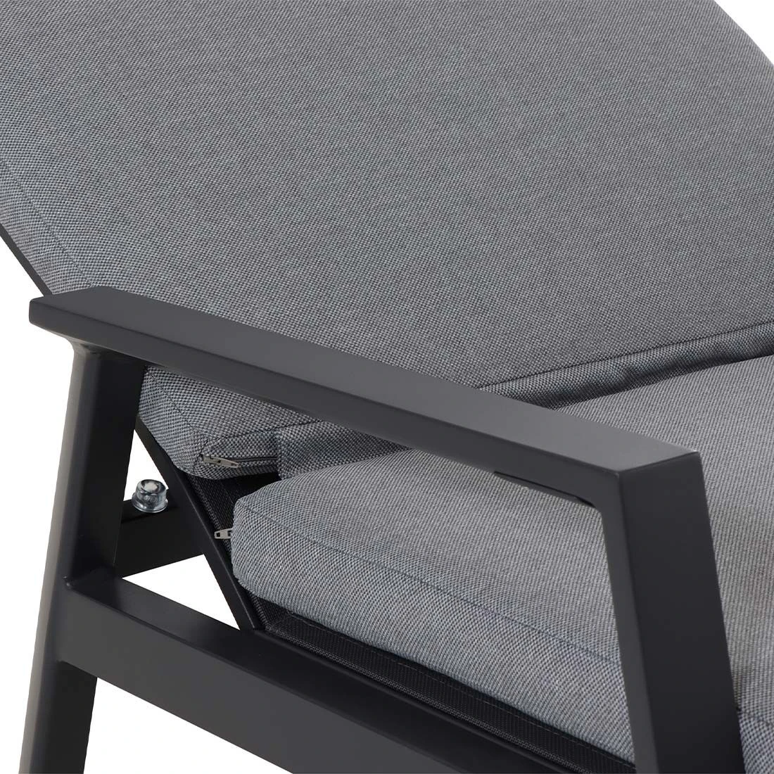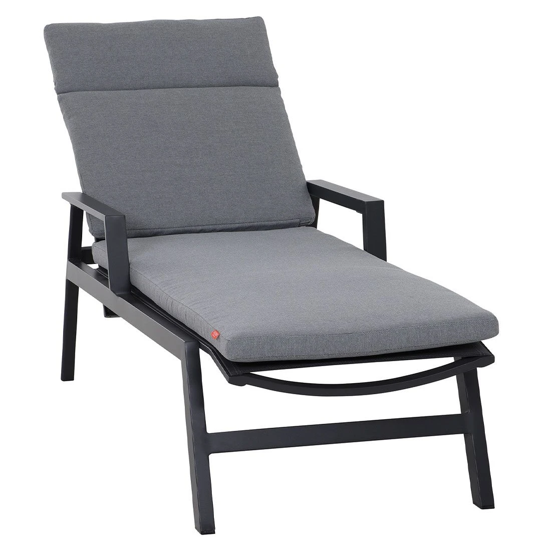 Für eine attraktive Optik ist das Gestell im Farbton Anthrazit gehalten. Die Sitzfläche der Gartenliege wird mit Textilgewebe bespannt. Die Farbgestaltung der Sitzfläche in Dunkelgrau ist überaus ansprechend. Den finalen Schliff erhält diese Gartenliege durch den Bezug in Salt&Pepper.