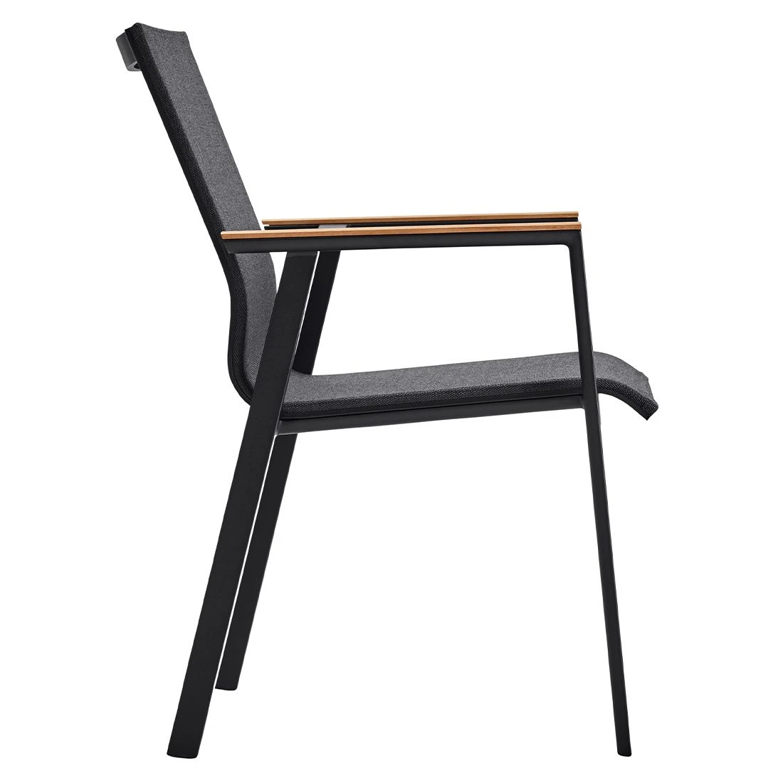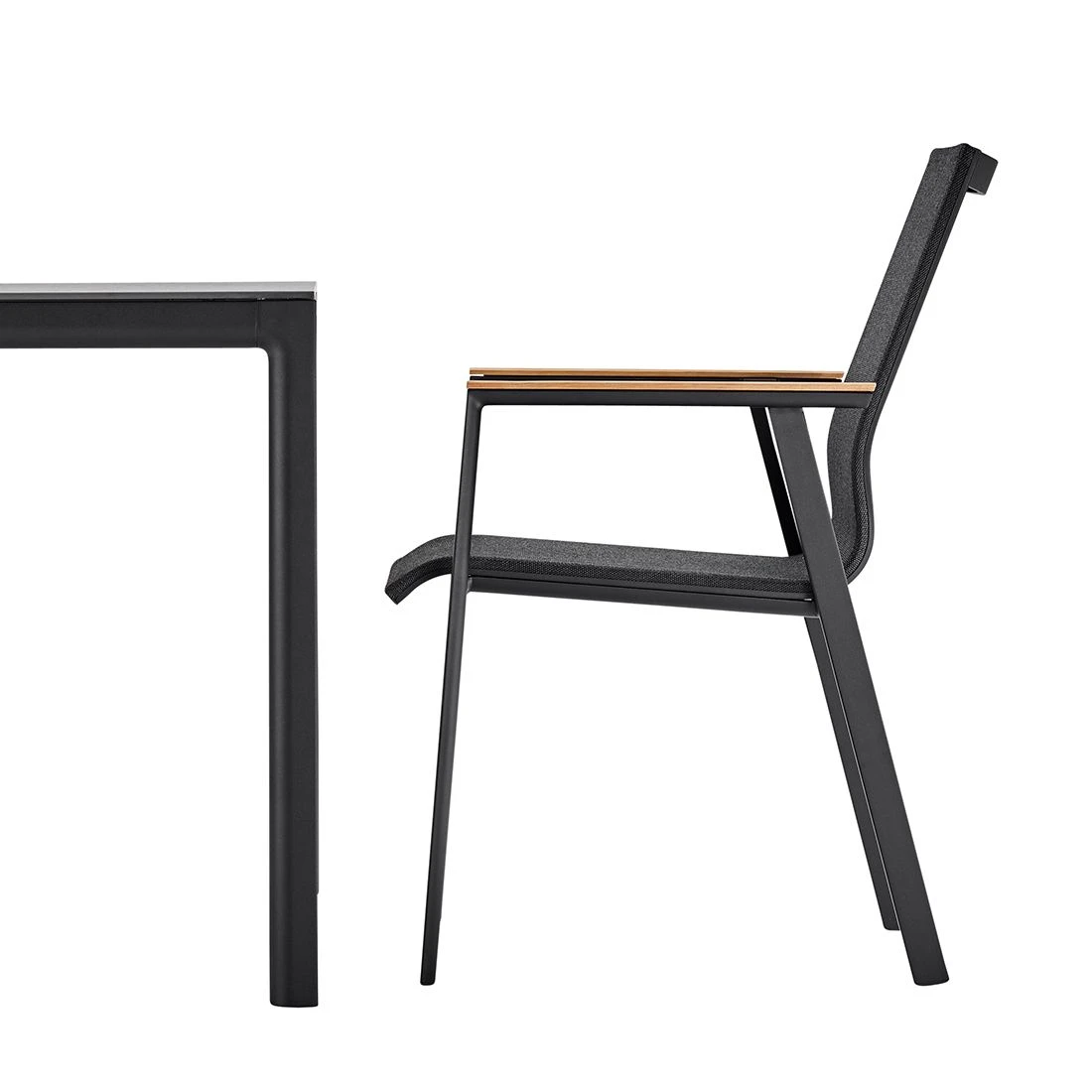 Für die Herstellung des Gestells wird hochwertiges und wetterfestes Aluminium verwendet. Für eine attraktive Optik ist das Gestell im Farbton Schwarz gehalten. Für die Bespannung der Sitzfläche verlässt sich der Hersteller auf hochwertiges Textilene. Es zeichnet sich durch eine hohe Robustheit gegenüber Hitze und Frost aus und ist leicht zu reinigen. Die Sitzfläche ist in ansprechendem Coal gehalten. Als klassische Design-Komponente fungiert das geradlinige Vierfußgestell.