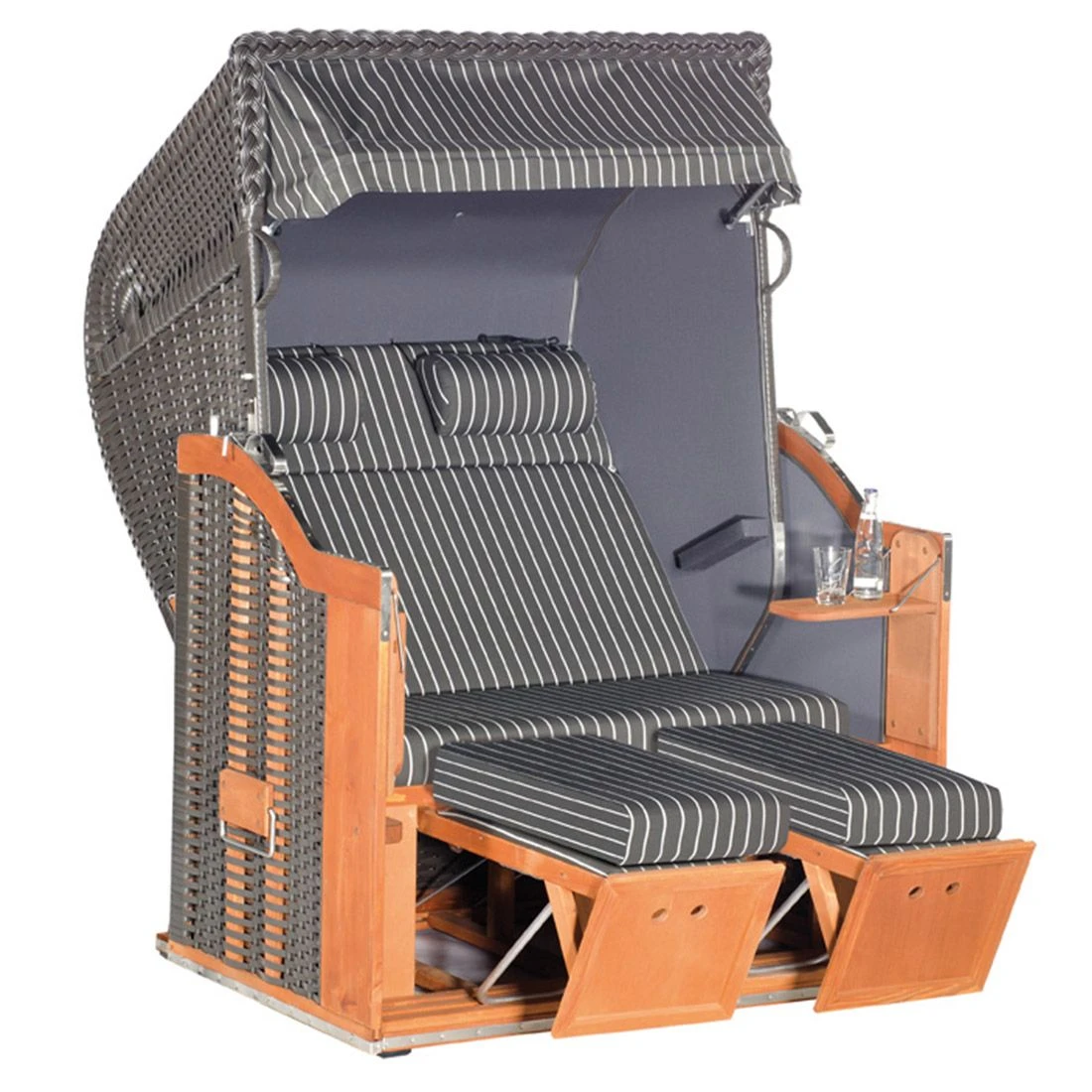 Die Bezüge des Strandkorbs bestehen aus Strukturpolyester-Gewebe. Das Material überzeugt mit einer angenehmen Haptik und einer hohen Witterungsbeständigkeit. Der Strandkorb selbst besteht aus Fichtenholz sowie Kunststoffgeflecht. Beides harmoniert hervorragend miteinander. Das Grundgerüst des Strandkorbs ist in Anthrazit gehalten. Darüber hinaus begeistert der Strandkorb Classic mit seinem Kunststoffgeflecht im Farbton Natur.