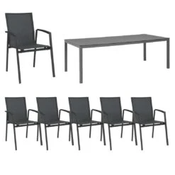 Das Gestell ist aus Aluminium gefertigt. Dadurch lassen sich die Möbel leicht von einem Standort zum nächsten transportieren und sind dennoch sehr stabil. Ein der Sitzmöbel ist die Bespannung der Sitzflächen mit Textilene in der Farbe Dunkelgrau. Dieses Material zeichnet sich durch eine hohe Robustheit gegenüber Hitze und Frost aus und ist leicht zu reinigen.