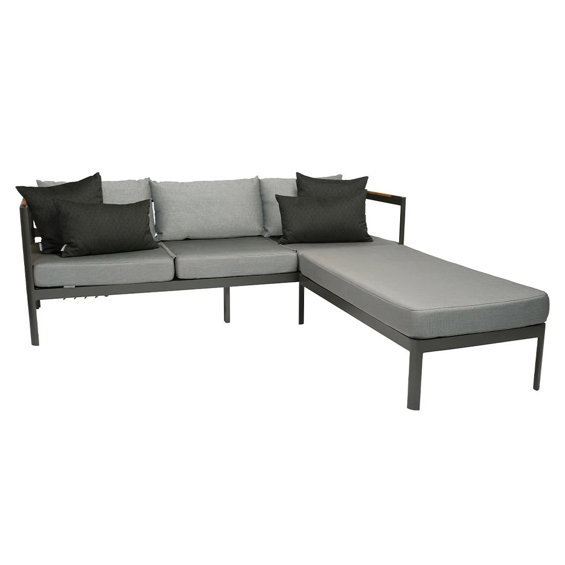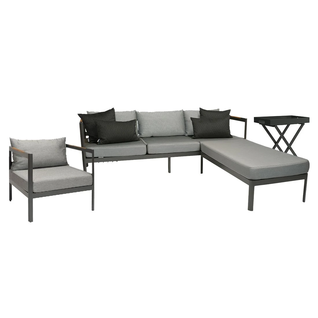 Das Gestell und die Tischplatte sind aus Aluminium gefertigt. Der Bezug ist aus robustem Outdoorstoff gefertigt, der Wind und Wetter gut standhält. Bei langen Feuchtigkeitsperioden empfehlen wir dennoch, für eine längere Haltbarkeit, eine Lagerung der abnehmbaren Kissen im Inneren. Die Farbe des Bezugs ist Seidengrau. Damit das Loungeset optisch ansprechend ist, sind das Gestell und die Tischplatte im Farbton Anthrazit gehalten.