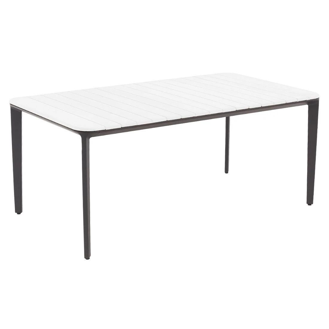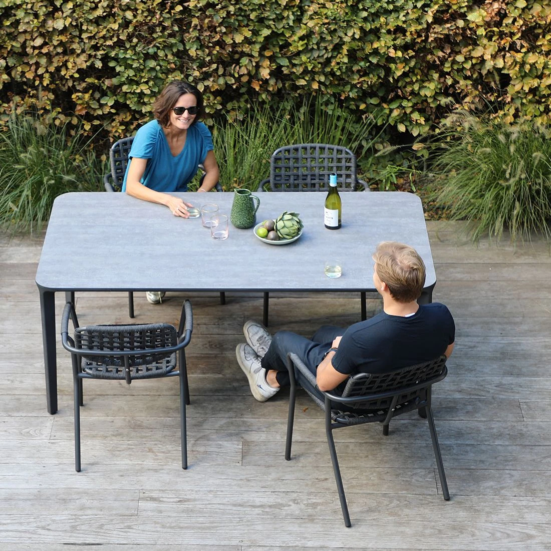 Aufgrund seines Gestells aus Aluminium zählt der Gartentisch Taro zu den modernen Tischmodellen, die sich im Garten komfortabel aufstellen und bewegen lassen. Optisch ist das Gestell in Graphit gehalten. Eine besonders schöne Optik bietet Ihnen die Tischplatte aus HPL-Kunststoffverbund. Diese im Naturdecor gehaltene Tischplatte ist dabei frostsicher und hitzebeständig bis maximal 180 °C. Für ein elegantes Gesamtbild erscheint die Platte in der Farbe Beton. Als klassische Design-Komponente fungiert das geradlinige Vierfußgestell. Die rechteckige Form ermöglicht es Ihnen, den Gartentisch in Ecken und an Häuserwänden platzsparend einzusetzen.